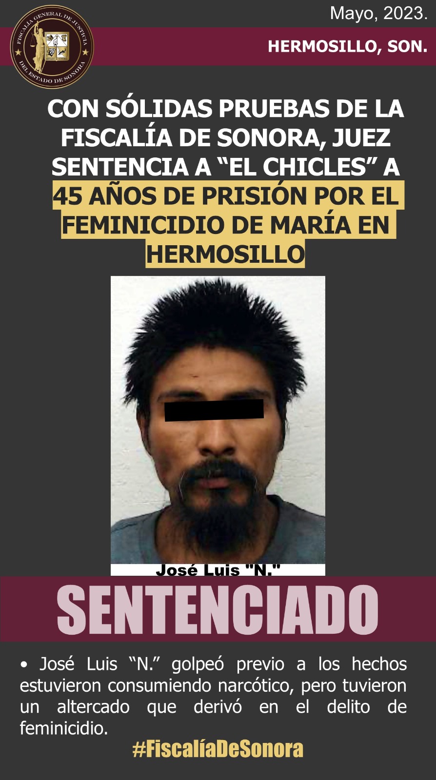 Hermosillo, Sonora.- Por el feminicidio de quien era su amiga, José Luis “N.”, “El Chicles”, purgará 45 años en prisión y deberá pagar casi 108 mil pesos en multa y reparación del daño, penas impuestas por el Juez ante las pruebas mostradas por la Fiscalía de Sonora.