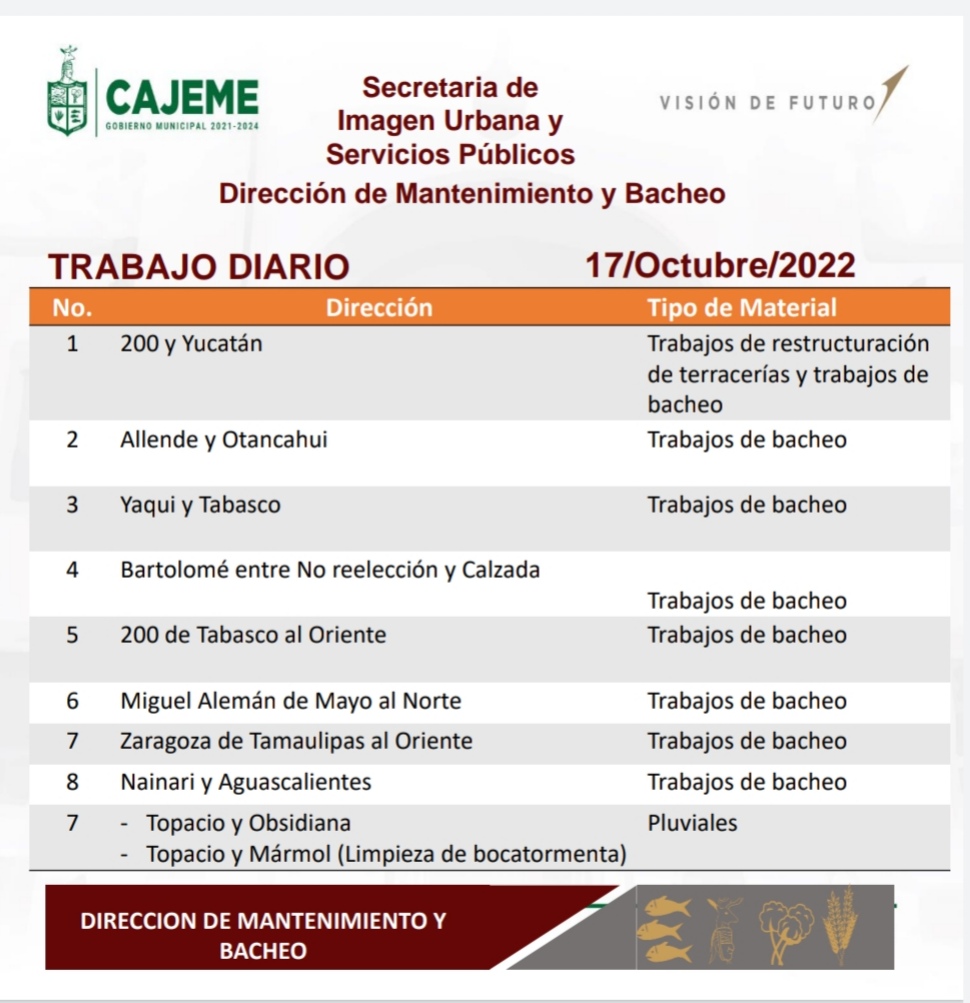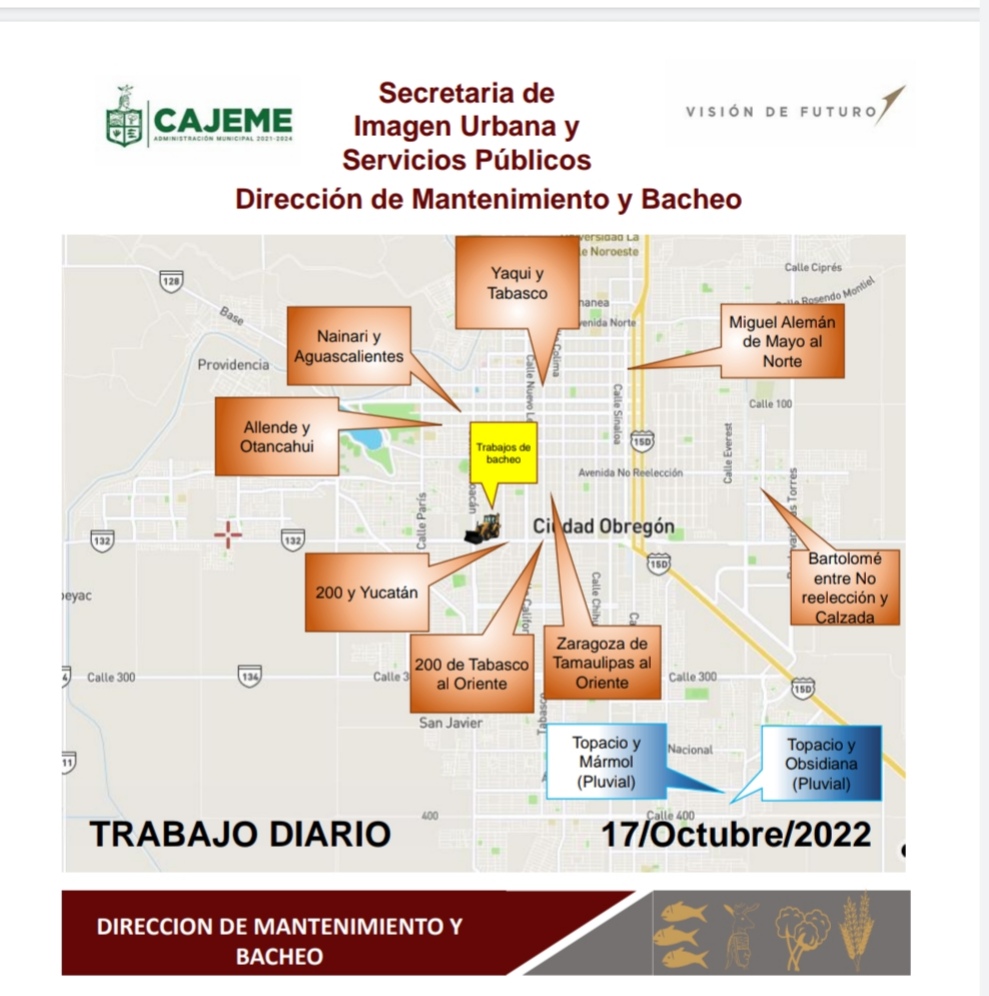 AGENDA DE TRABAJO EN BACHEO Y ATENCIÓN DE DRENAJES HOY 117 DE OCTUBRE POR PARTE DEL AYUNTAMIENTO DE CAJEME 17 de octubre de 2022 FacebookTwitterPinterestWhatsApp AGENDA DE TRABAJO EN BACHEO Y ATENCIÓN DE DRENAJES HOY 117 DE OCTUBRE POR PARTE DEL AYUNTAMIENTO DE CAJEME