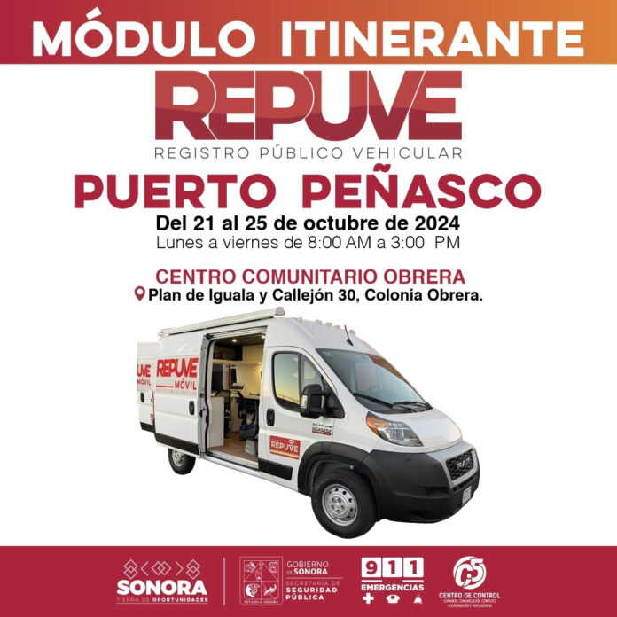Puerto Peñasco, Sonora.- El módulo itinerante del Registro Público Vehicular (Repuve) inició este lunes 21 de octubre con el recorrido por municipios para atender a la ciudadanía interesada en realizar el trámite de regularización de autos usados de procedencia extranjera informó, la Secretaría de Seguridad Pública (SSP) en Sonora.
