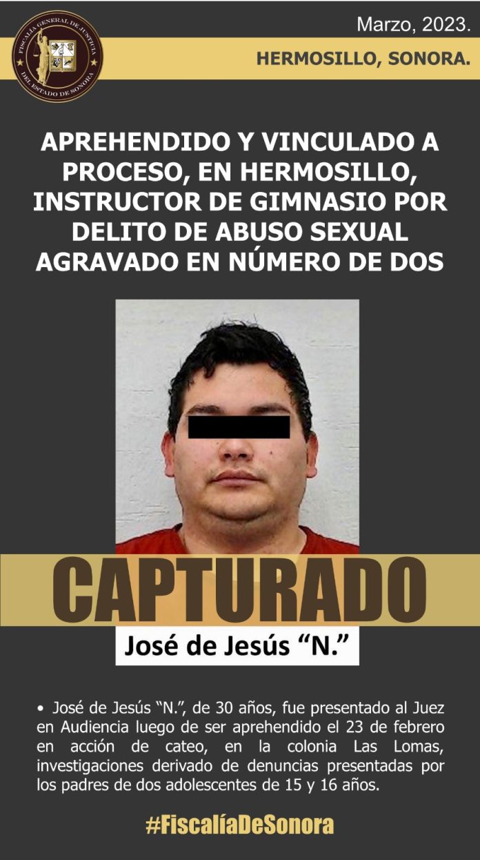 Es por hechos registrados en mayo, entre julio y agosto de 2021, diciembre de 2022 y enero de 2023, donde presuntamente José de Jesús “N.” cometió los delitos, en algunas ocasiones en el interior de un gimnasio ubicado en la colonia Y Griega, en Hermosillo. Las indagatorias se mantienen.