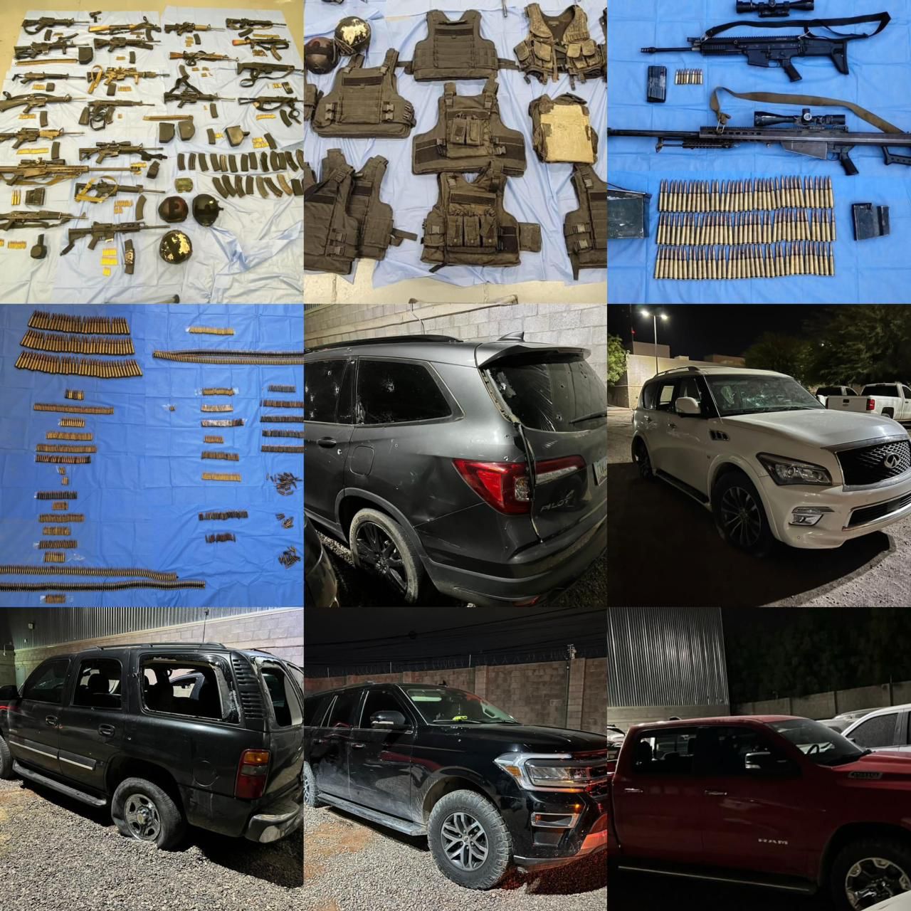 Derivado de dicha acción, se dio un enfrentamiento en diferentes lugares sobre la Carretera 100, donde fueron asegurados 21 fusiles de asalto de diferentes calibres (BARRET, SCAR, AR15, AK 47 entre otras), incluyendo calibre .50, una arma corta, cargadores de fusil, cargadores de caja, chalecos balísticos, cascos tácticos, vestimenta camuflajeada y un número considerable de cartuchos que aún se están contabilizando.