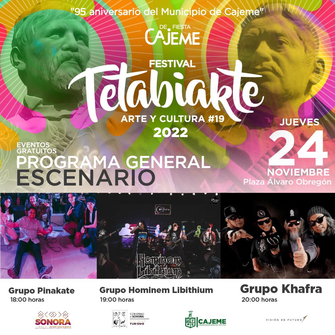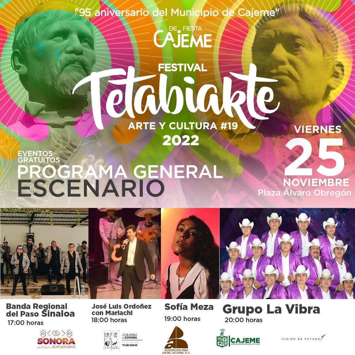 En el marco del 95 aniversario del municipio, el Ayuntamiento de Cajeme te invita al Festival de Arte y Cultura Tetabiakte 2022, del 24 al 29 de noviembre, con presentaciones culturales y artísticas en la Plaza Álvaro Obregón, así como en las comisarías. ¡No te lo puedes perder!
