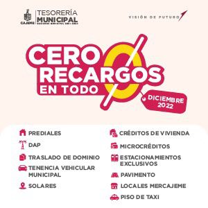 cero recargos en los pagos de Tesorería Municipal 24 de diciembre de 2022 FacebookTwitterPinterestWhatsApp La Navidad llegó acompañada de cero recargos en los pagos de Tesorería Municipal. Puedes acudir al módulo móvil o realizar tu pago en línea. Aprovecha los descuentos que Cajeme tiene para ti.