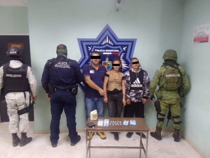 Al ser detectados en un operativo conjunto conduciendo a exceso de velocidad en un vehículo, dos hombres y una mujer fueron detenidos por agentes de la Policía Municipal, Guardia Nacional y la Secretaría de la Defensa Nacinal, quienes al realizar una inspección les descubrieron cerca de 100 envoltorios de cristal, siendo vinculados por la presunta comisión del delito contra la salud.