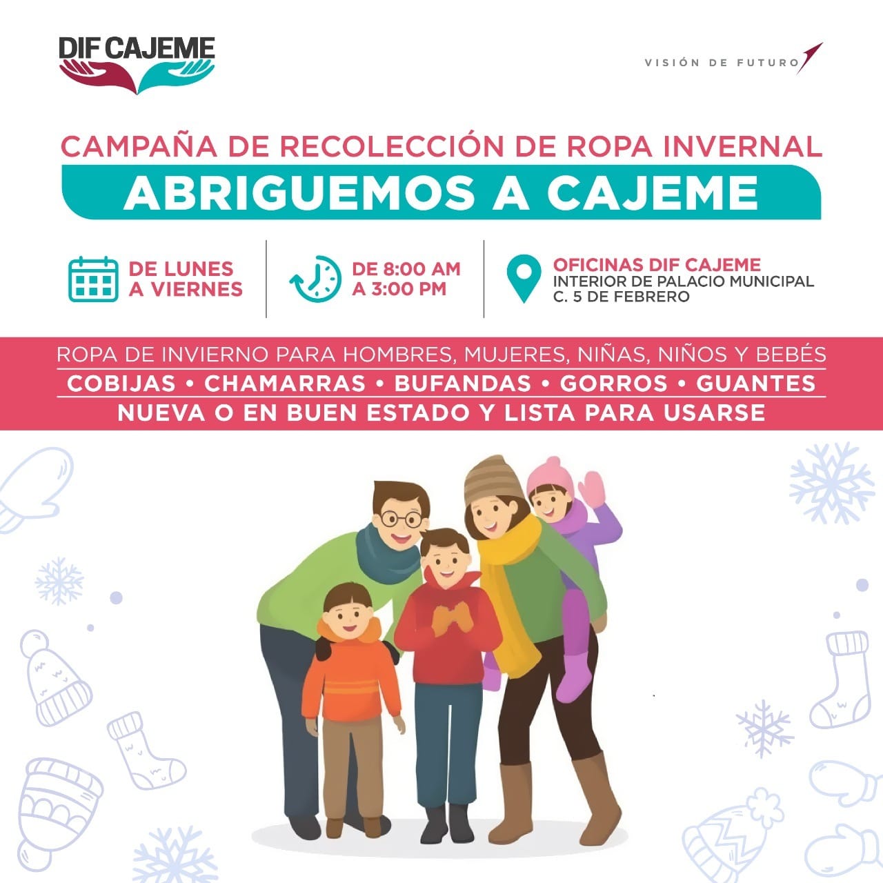DIF Cajeme invita a la comunidad a participar en este bello acto de caridad para apoyar a personas de bajos recursos con cobijas, chamarras y ropa calentita, buscando que esta temporada invernal sea un Cajeme abrigador para todas y todos.