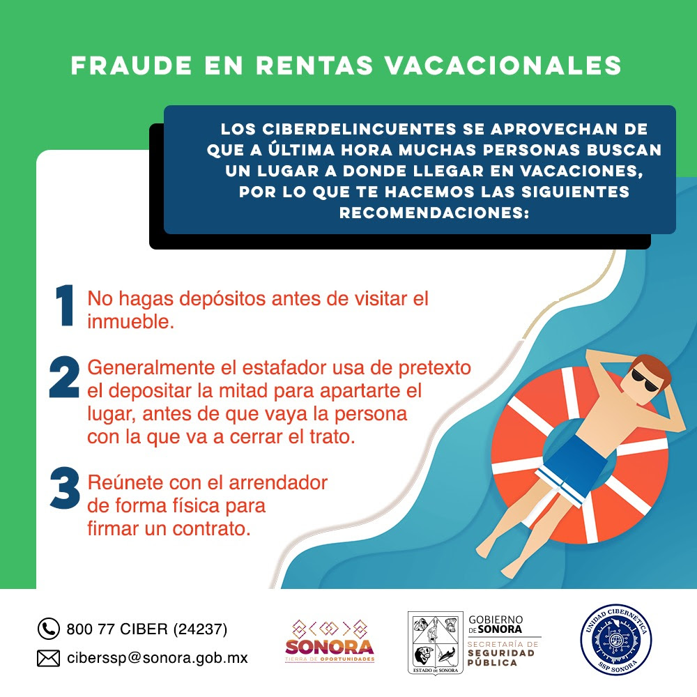 Hermosillo, Sonora.- En esta temporada vacacional, la Unidad Cibernética de la Secretaría de Seguridad Pública (SSP) de Sonora, recomendó a la ciudadanía extremar medidas de prevención al momento de rentar inmuebles para hospedarse y evitar ser víctima de fraude.
