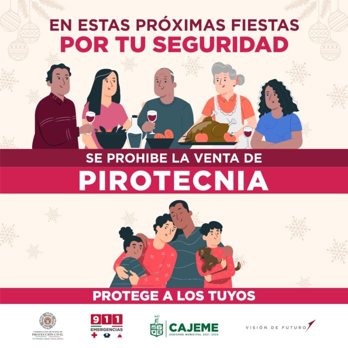 EN EL MUNICIPIO DE CAJEME, ESTA PROHIBIDA LA VENTA DE PIROTECNIA 24 de diciembre de 2022 FacebookTwitterPinterestWhatsApp EN EL MUNICIPIO DE CAJEME, ESTA PROHIBIDA LA VENTA DE PIROTECNIA, SE HACE UN LLAMADO A LOS CIUDADANOS PARA QUE SEAN CONSCIENTES DE LOS RIESGOS QUE EXISTEN AL UTILIZAR PIROTECNIA DURANTE LAS FIESTAS DECEMBRINAS.