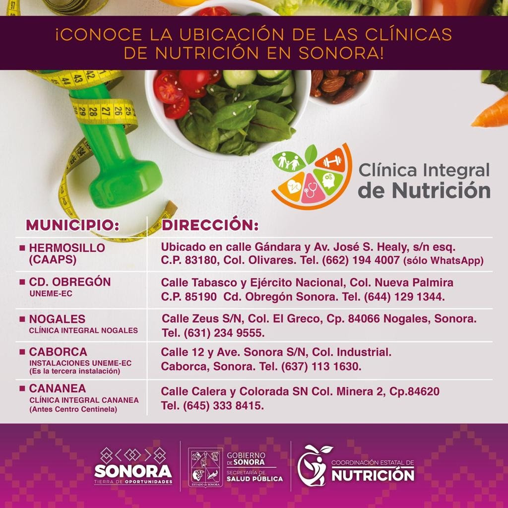 Las clínicas integrales de nutrición se ubican en Hermosillo, Ciudad Obregón, Nogales, Caborca y Cananea, y se prevé que para el próximo año se abran más en los municipios de San Luis Río Colorado y Agua Prieta.