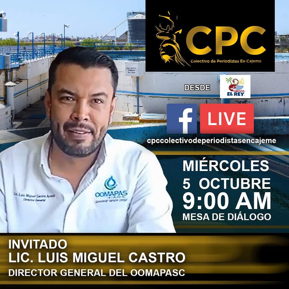 Éste miércoles 5 de octubre El Colectivo de Periodistas en Cajeme CPC te invita a la mesa de trabajo diálogo y análisis en vivo con la presencia del Director General del OOMAPAS DE CAJEME