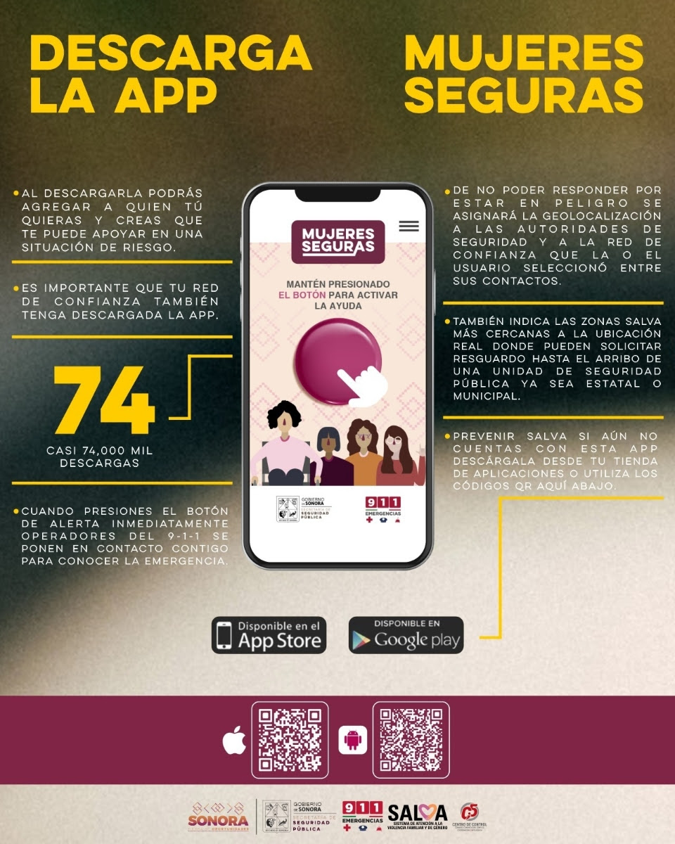 Hermosillo, Sonora.- Como parte de la estrategia de seguridad hacia las mujeres el Gobierno de Sonora invitó a descargar la aplicación móvil Mujeres Seguras que esta enlazada a la línea de emergencias 9-1-1 y puede ser de gran utilidad en caso de sentirse en riesgo o peligro.