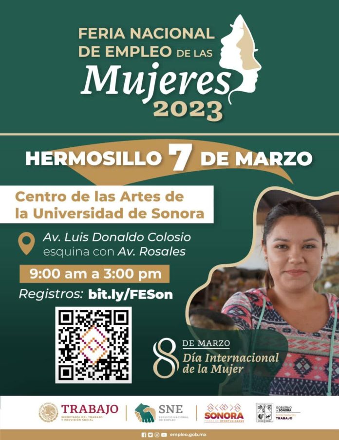 Hermosillo, Sonora.- La Secretaría del Trabajo y Previsión Social (STyPS), con el apoyo del Gobierno de Sonora, llevará a cabo la Feria Nacional del Empleo de las Mujeres 2023, este martes 7 de marzo, en el Centro de las Artes de la Universidad de Sonora.