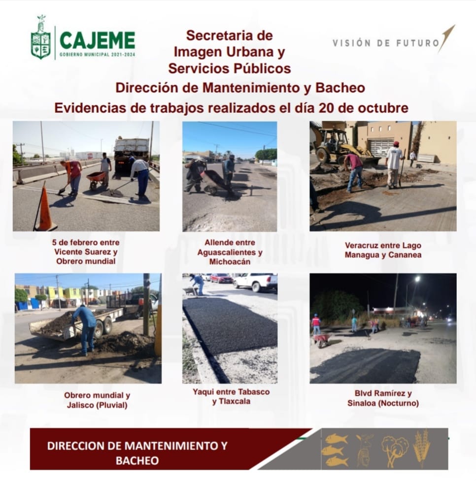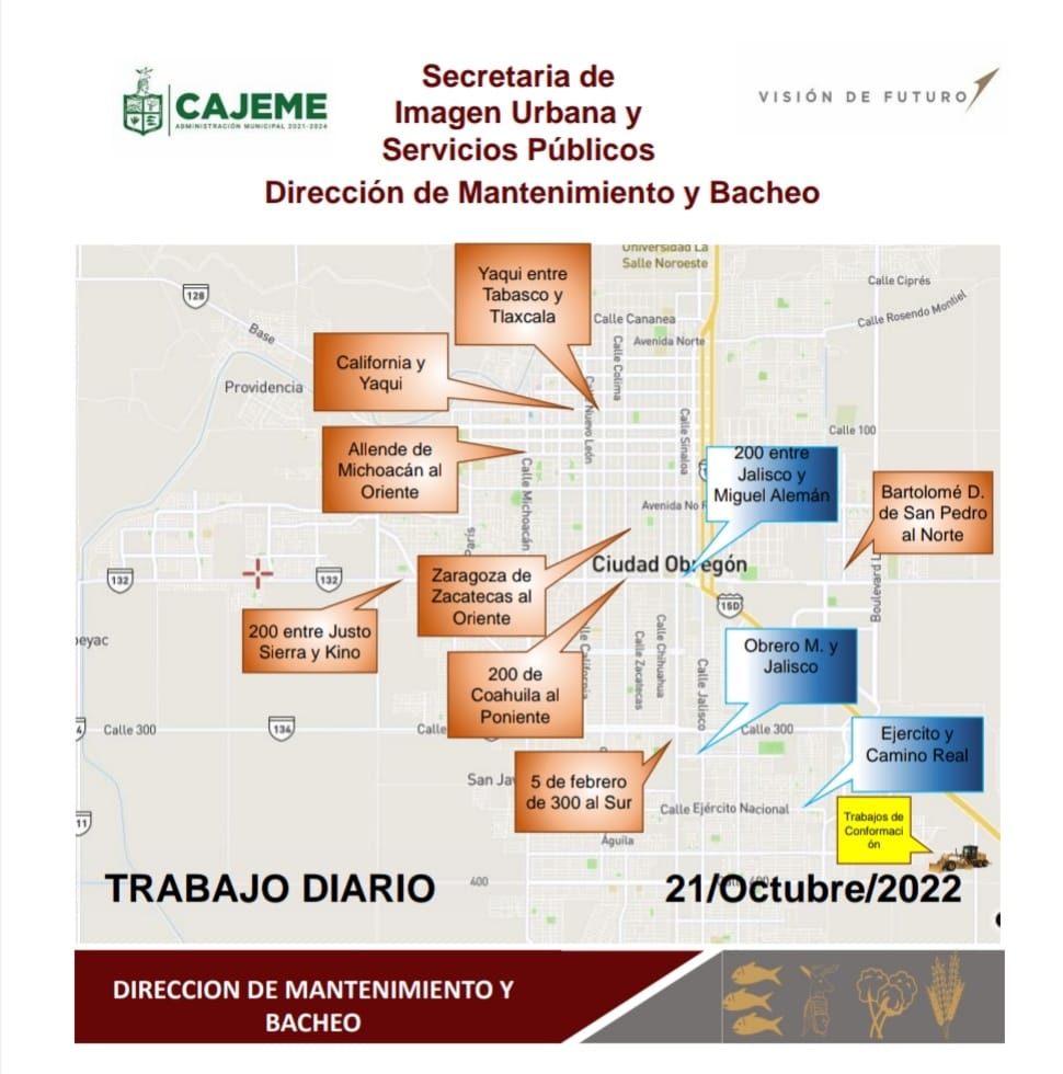PUNTOS DE LA CIUDAD EN LOS CUALES SE TRABAJA HOY 21 DE OCTUBRE EN BACHEO Y REPARACIÓN DE VIALIDADES 21 de octubre de 2022 FacebookTwitterPinterestWhatsApp PUNTOS DE LA CIUDAD EN LOS CUALES SE TRABAJA HOY 21 DE OCTUBRE EN BACHEO Y REPARACIÓN DE VIALIDADES,POR LA CUADRILLAS DEL MUNICIPIO DE CAJEME