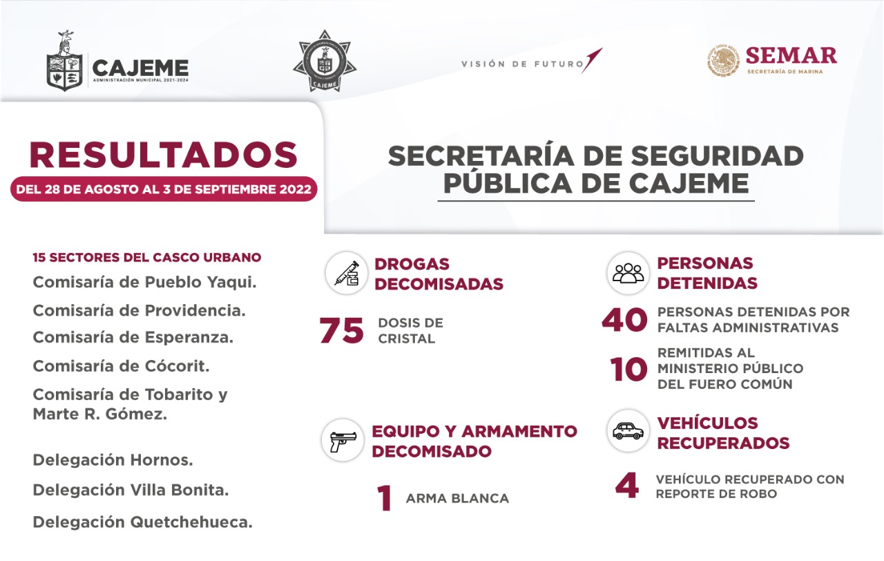 Las acciones de la Secretaría de Seguridad Pública en Cajeme dieron como resultado un total de 50 personas detenidas por elementos de la Policía Municipal en coordinación con la Secretaría de Marina y las diversas corporaciones, de los cuales 40 fueron por faltas administrativas y 10 se turnaron al Ministerio Público del Fuero Común.